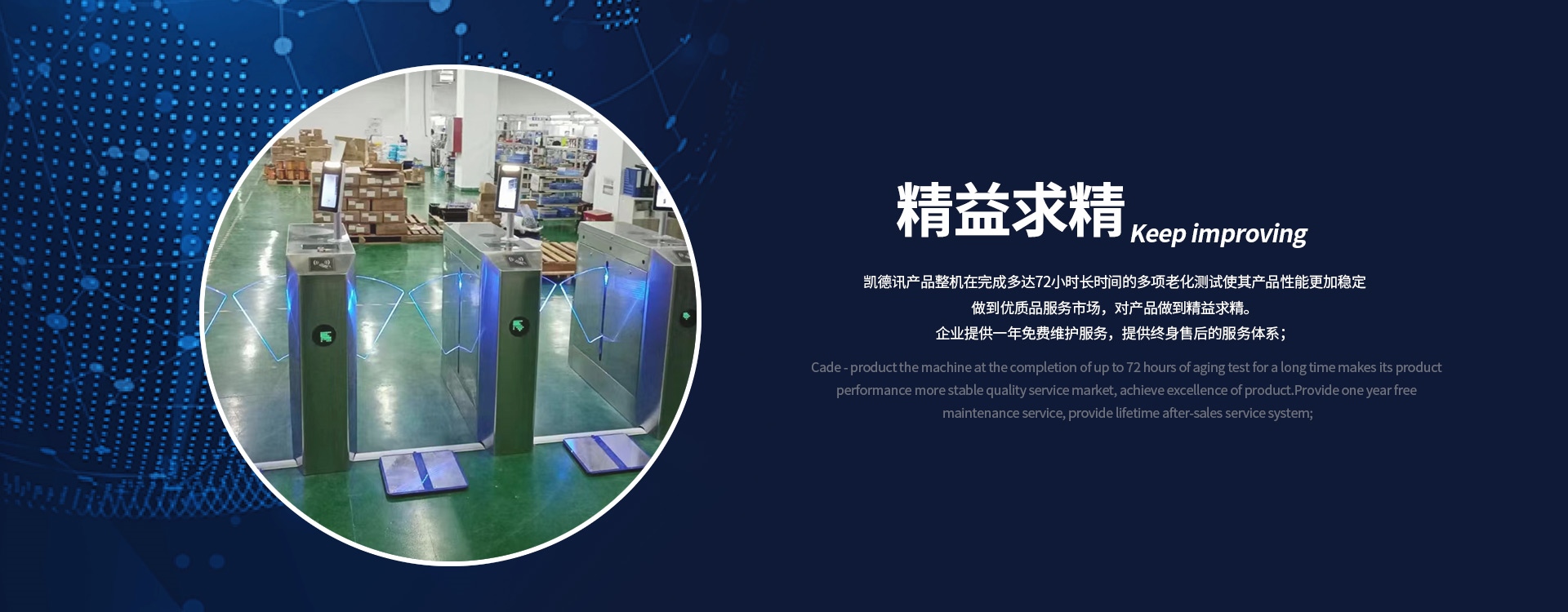 深圳市凱德訊科技有限公司成立于2003年,注冊(cè)資本500萬(wàn)元,位于港珠澳大灣區(qū)的深圳市,公司集研發(fā)、生產(chǎn)、銷售電子行業(yè)防靜電門(mén)禁系統(tǒng)和民用智能通道系統(tǒng)的綜合性企業(yè)。公司擁有自主產(chǎn)權(quán)的產(chǎn)品并一直致力于ESD門(mén)禁系統(tǒng)、智能安防門(mén)禁系統(tǒng)、景區(qū)通道閘機(jī)、人臉識(shí)別閘機(jī)、消費(fèi)系統(tǒng)、智能翼閘的研發(fā)生產(chǎn)與銷售。凱德訊目前擁有多款功能齊全的系統(tǒng)軟件及多款硬件產(chǎn)品,包含成型加工、機(jī)芯研發(fā)、軟件開(kāi)發(fā)等技術(shù)均為本公司自主研發(fā)、獨(dú)立完成。14年來(lái),凱德訊一直秉承以用戶需求為核心,穩(wěn)定、實(shí)用、智能的產(chǎn)品是我們開(kāi)拓市場(chǎng)的基石,務(wù)實(shí)進(jìn)取的精神是我們孜孜不倦的追求,全方位真誠(chéng)的服務(wù)是我們對(duì)您永恒的承諾。